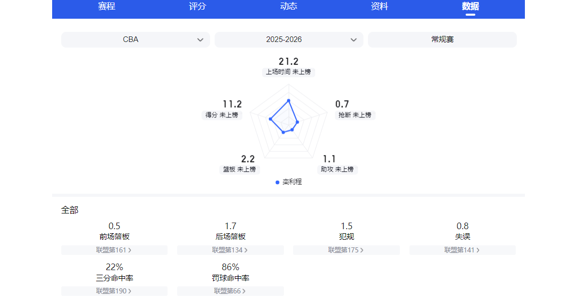 栾利程是21年CBA选秀大会首轮第五顺位,当时被北京男篮选中。不过来到北京队后,他并未得到球队重视,也不在球队培养计划之内。首个CBA赛季,他仅获得1次出场机会,出场时间只有4分钟。加盟北京男篮的第二个赛季,他也仅获得7次出场机会。